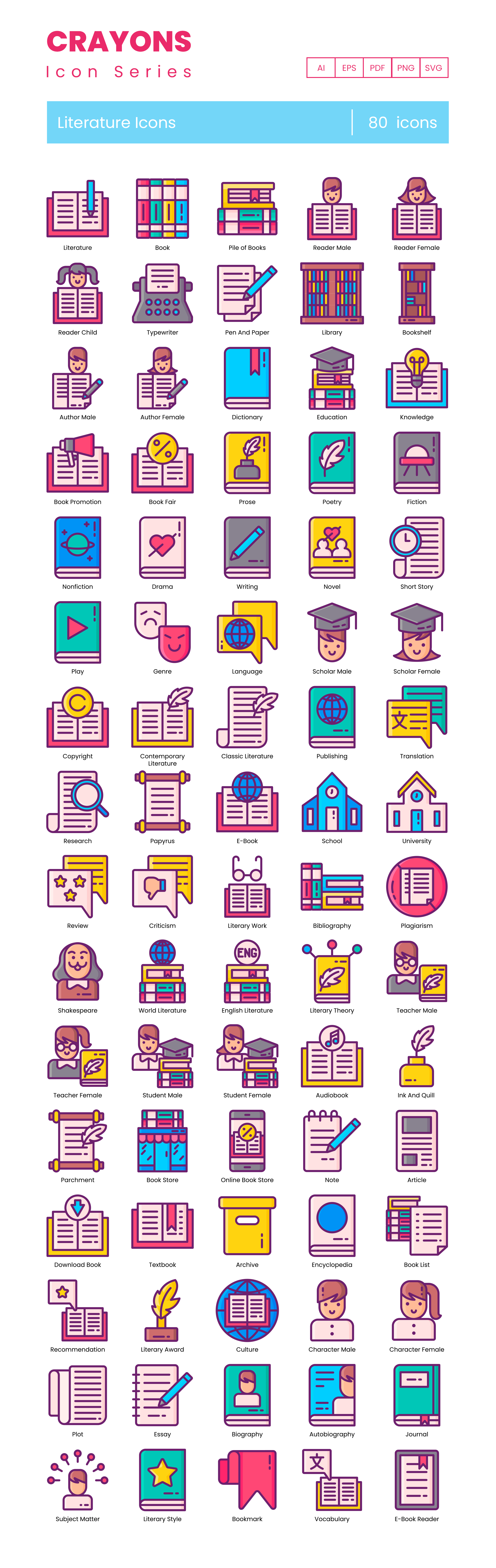 TL;DR: 80 Books vector icons. 5 formats, fully customizable. Find the full icon list below.