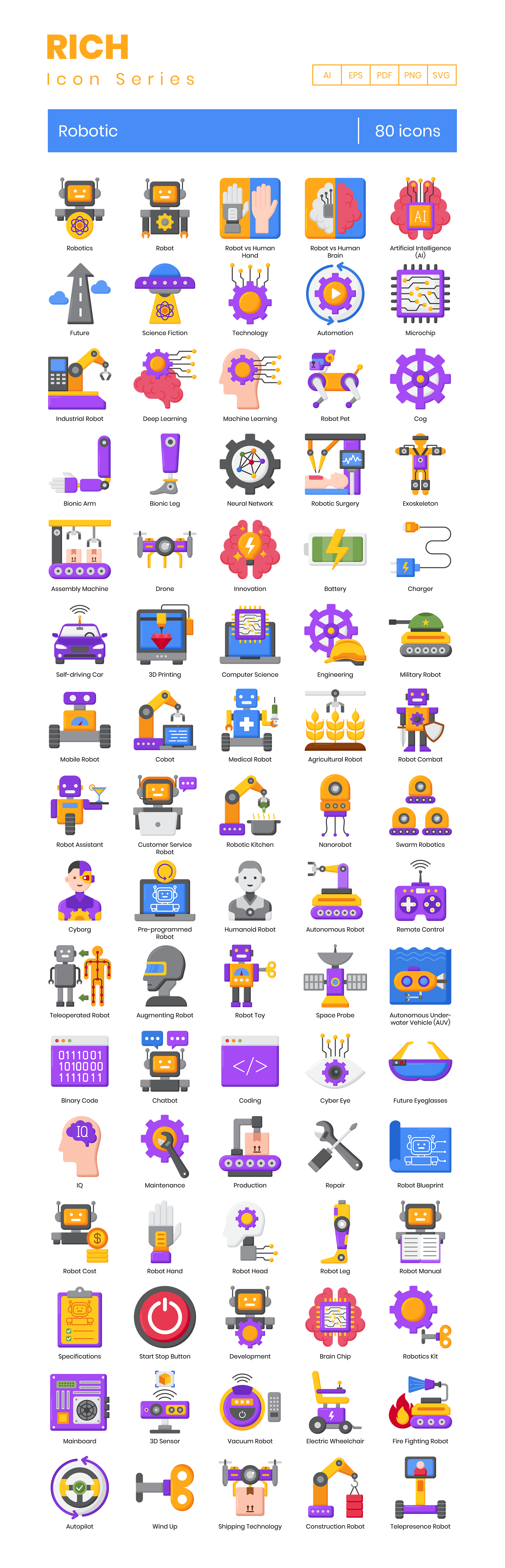 TL;DR: 80 Bot Tech vector icons. 5 formats, fully customizable. Find the full icon list below.