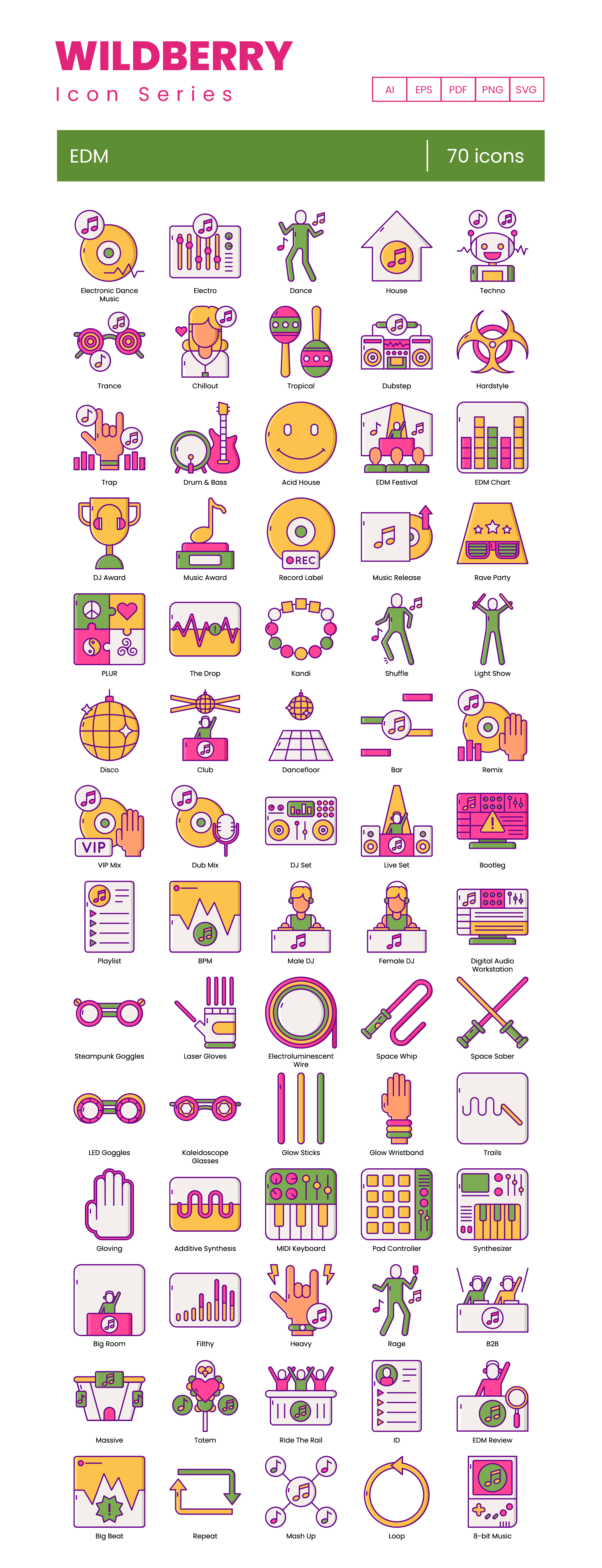 TL;DR: 70 EDM vector icons. 5 formats, fully customizable. Find the full icon list below.