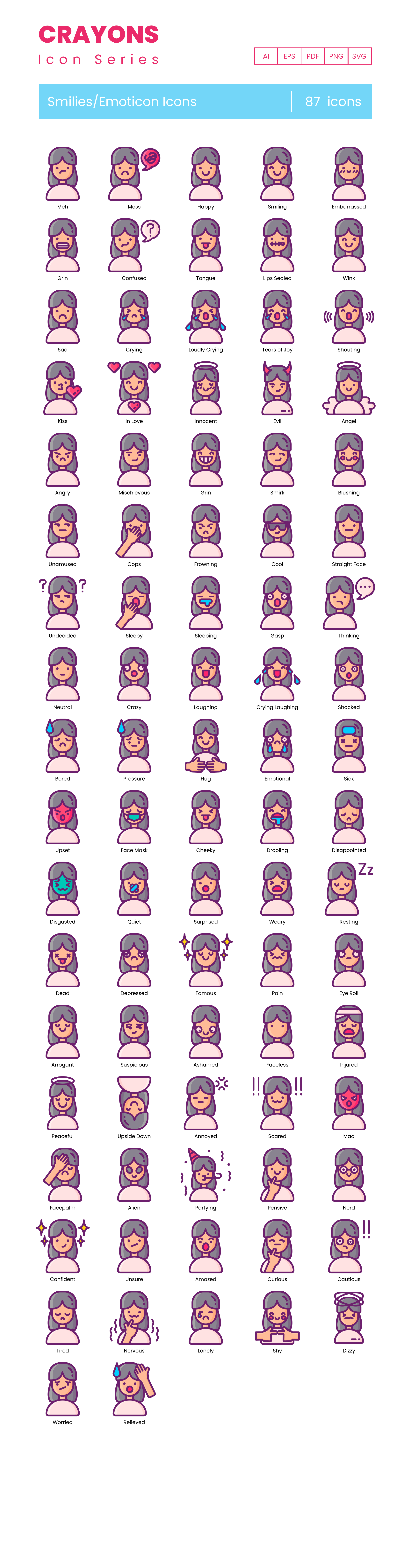 TL;DR: 87 Emojis vector icons. 5 formats, fully customizable. Find the full icon list below.