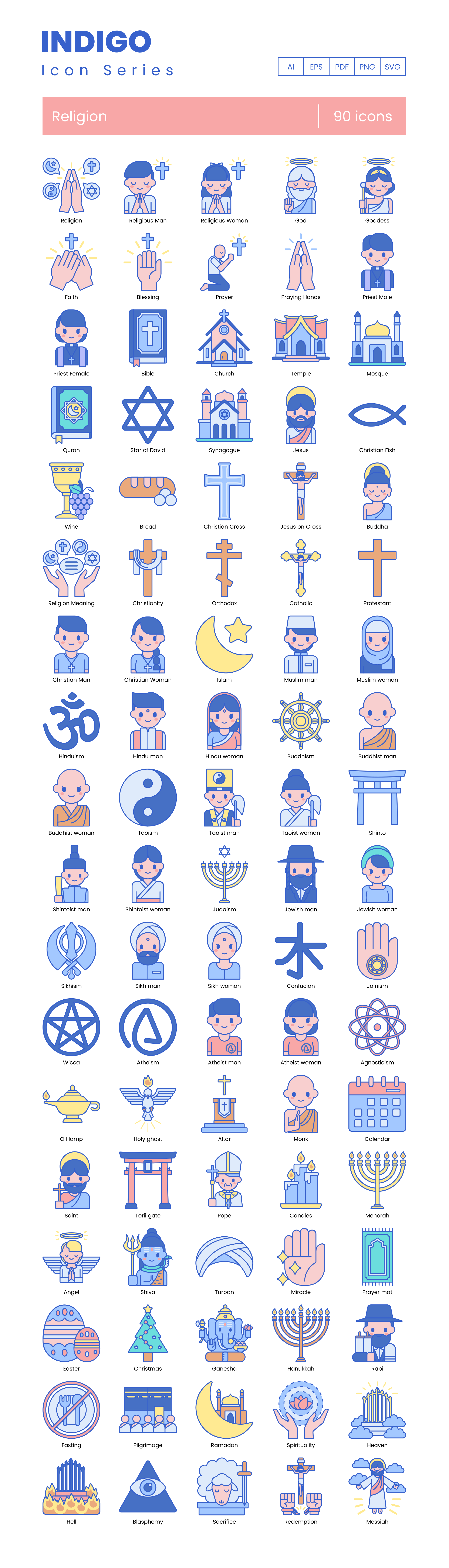 TL;DR: 90 Faith vector icons. 5 formats, fully customizable. Find the full icon list below.