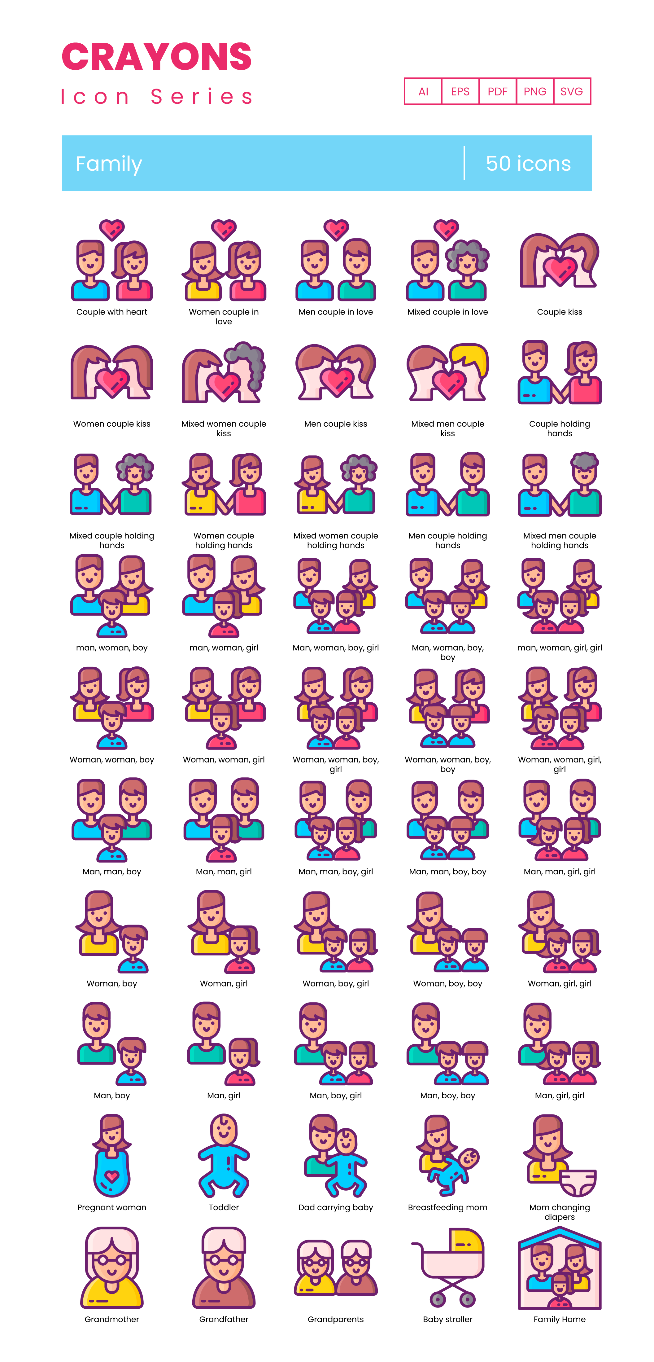 TL;DR: 50 Family vector icons. 5 formats, fully customizable. Find the full icon list below.