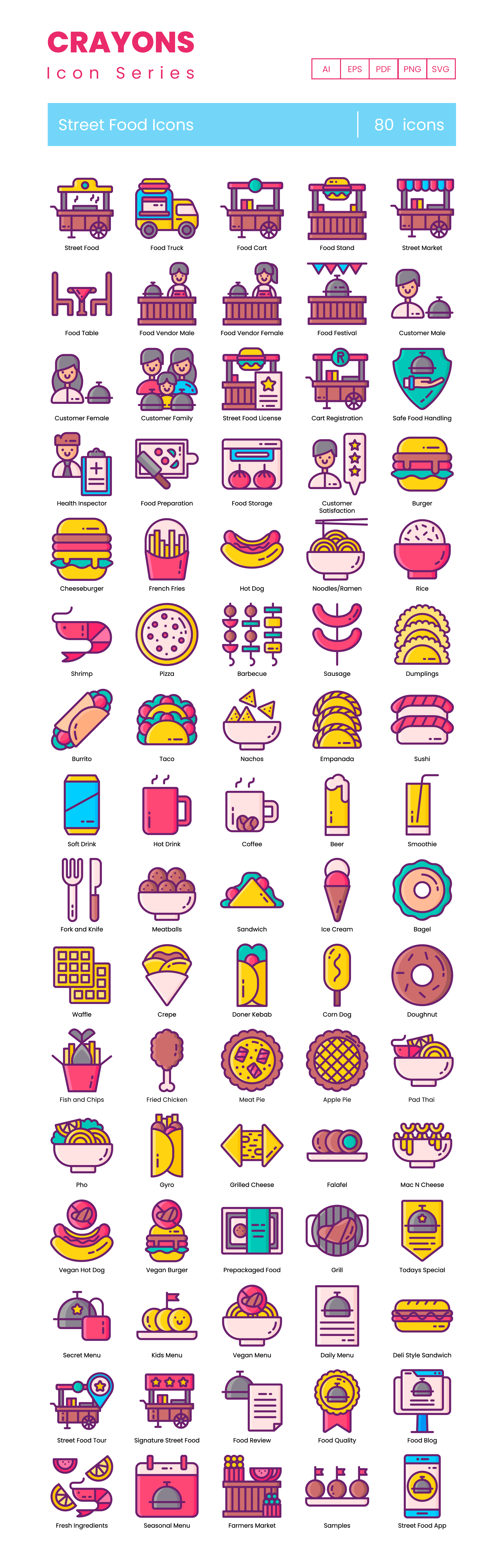 TL;DR: 80 Food Trucks vector icons. 5 formats, fully customizable. Find the full icon list below.