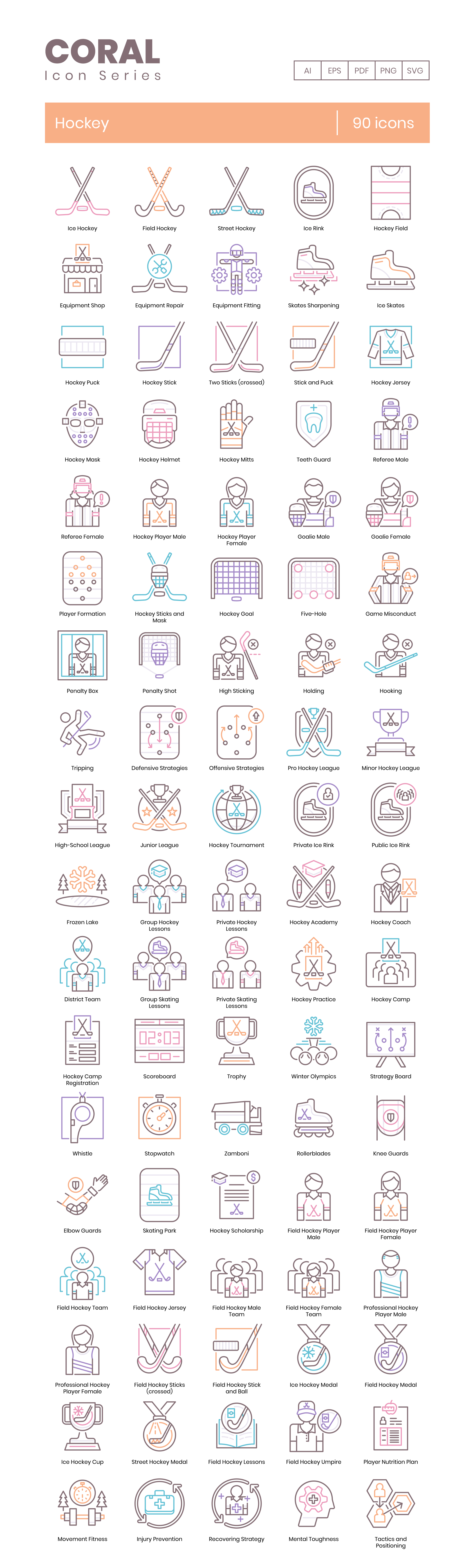 TL;DR: 90 Ice Hockey vector icons. 5 formats, fully customizable. Find the full icon list below.