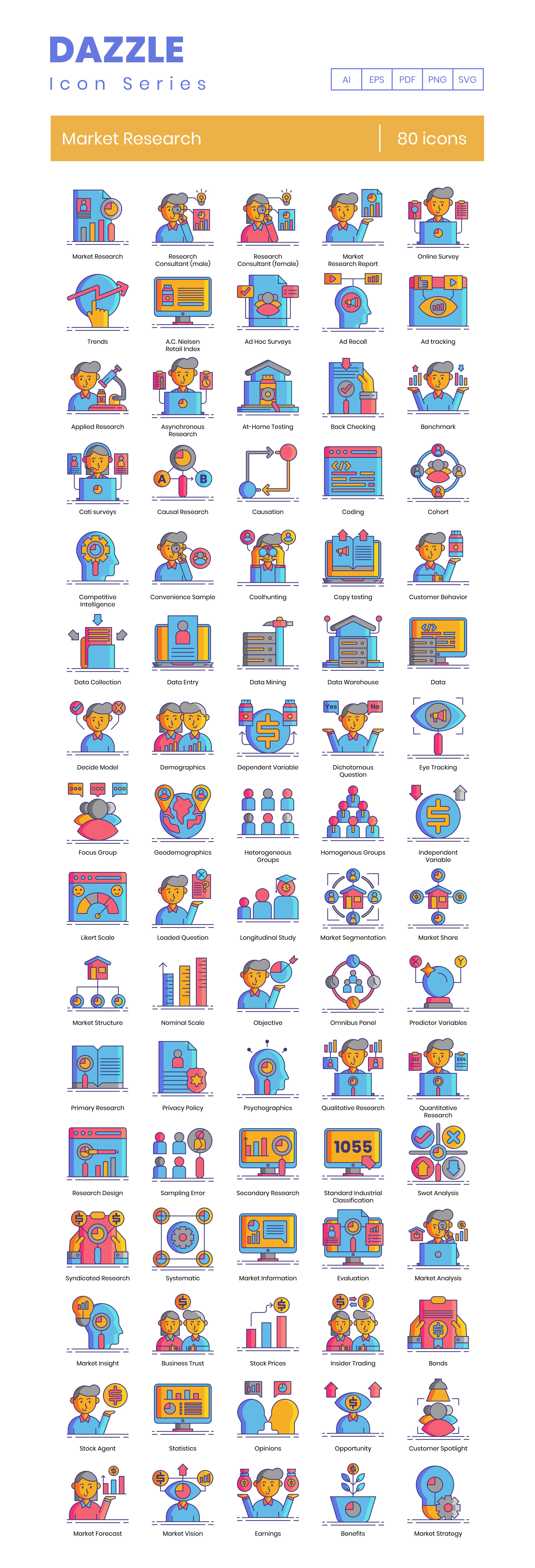 TL;DR: 80 Market Research vector icons. 5 formats, fully customizable. Find the full icon list below.