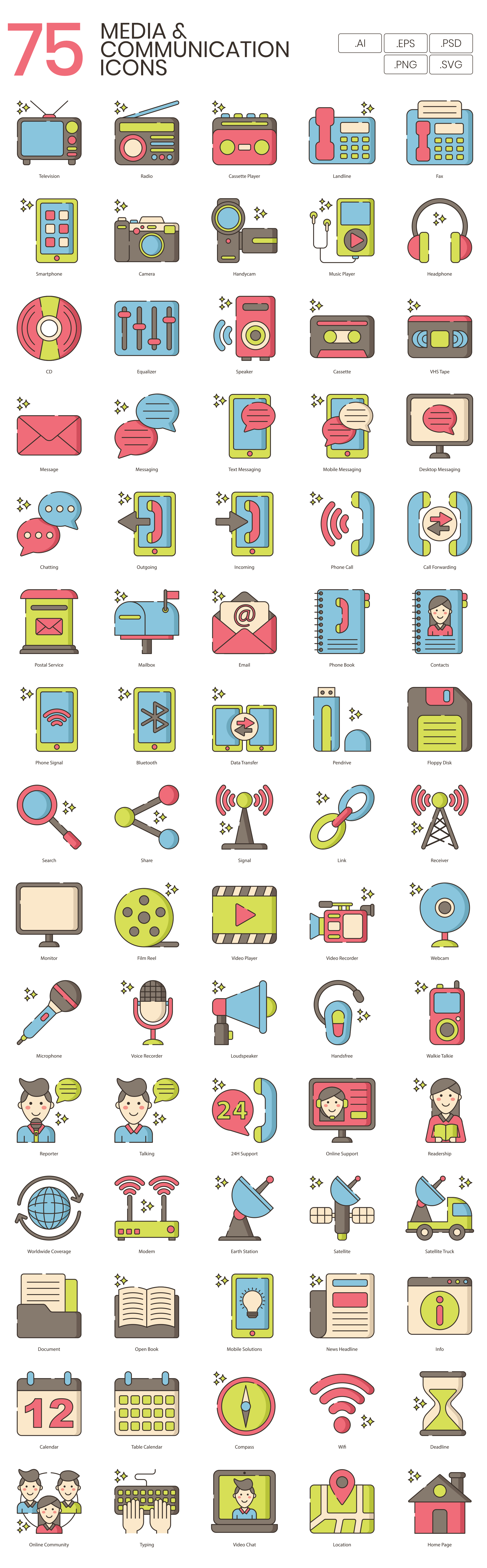 TL;DR: 75 Media Comm vector icons. 5 formats, fully customizable. Find the full icon list below.