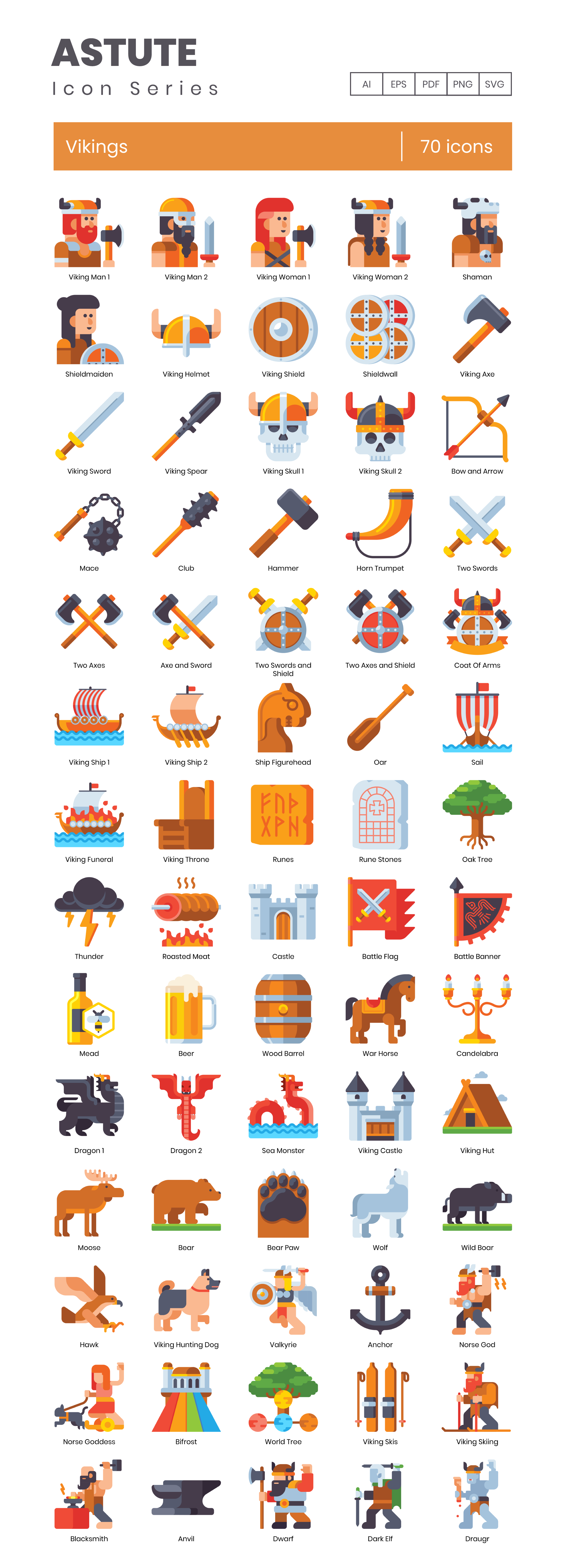 TL;DR: 70 Norsemen vector icons. 5 formats, fully customizable. Find the full icon list below.