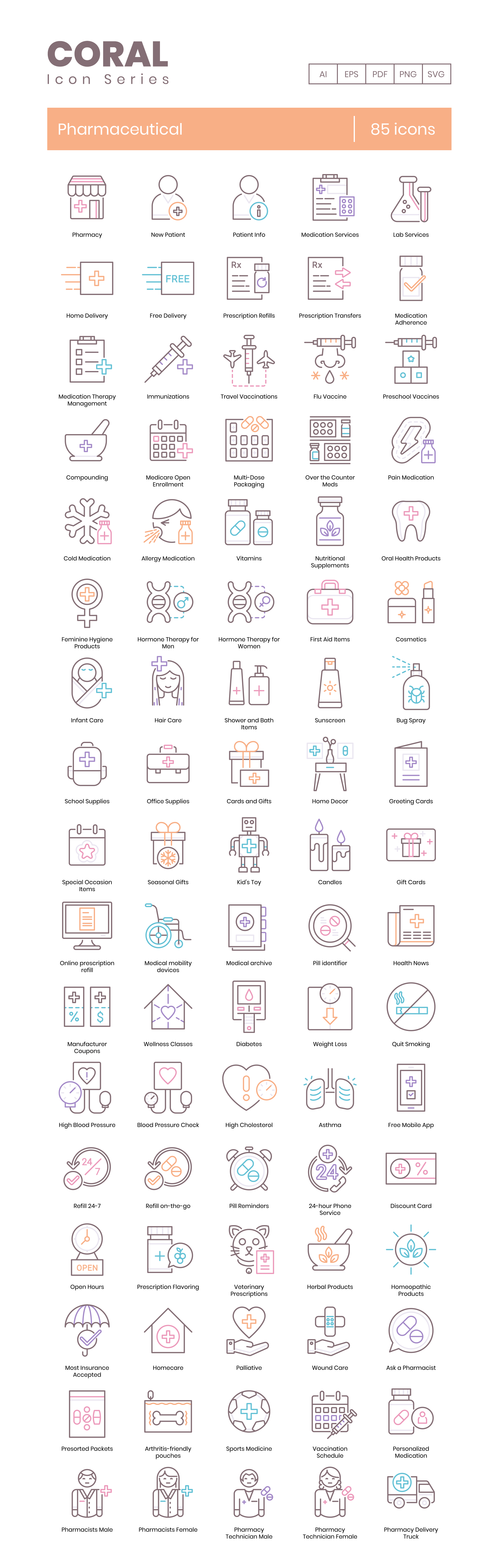 TL;DR: 85 Pharma vector icons. 5 formats, fully customizable. Find the full icon list below.