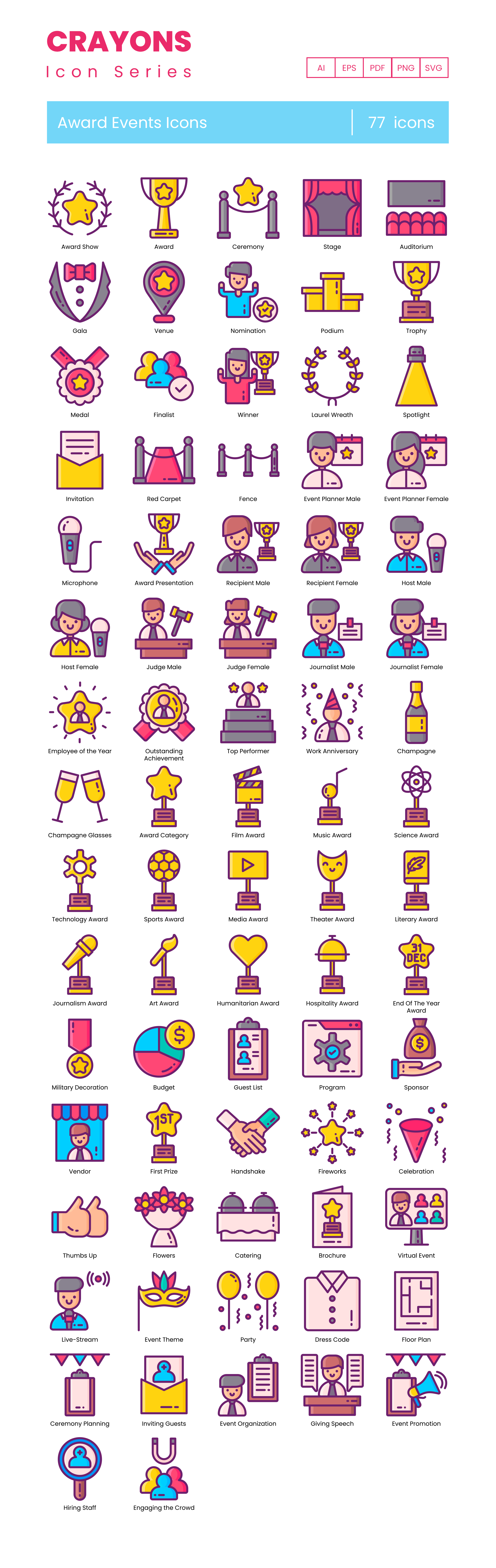 TL;DR: 77 Prize Ceremony vector icons. 5 formats, fully customizable. Find the full icon list below.