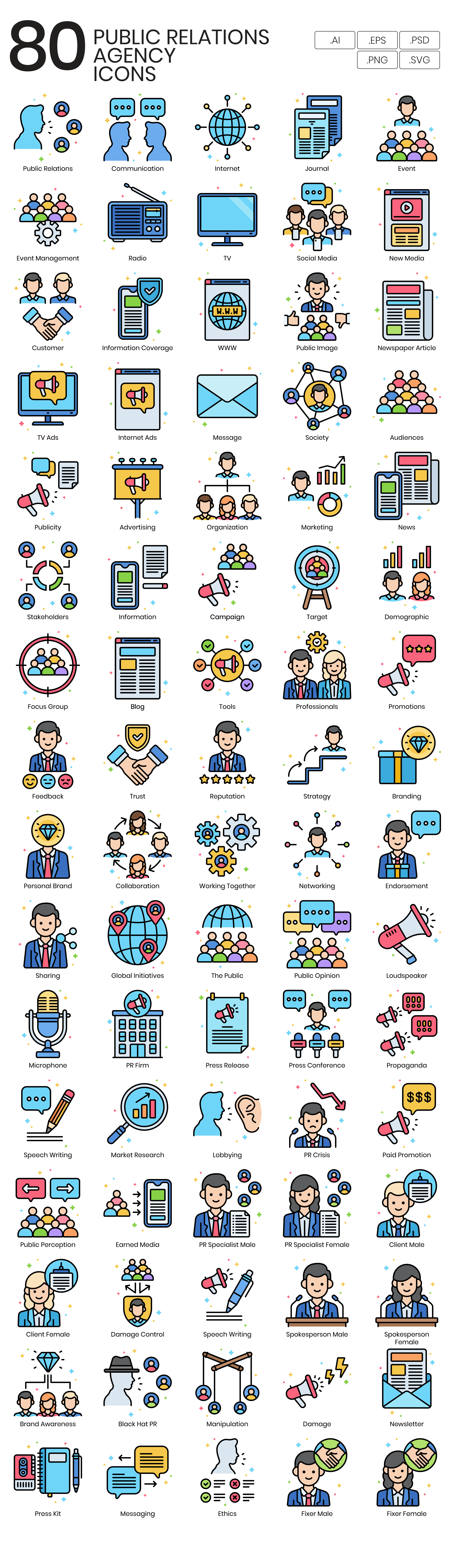 TL;DR: 80 Public Relations Agency vector icons. 5 formats, fully customizable. Find the full icon list below.