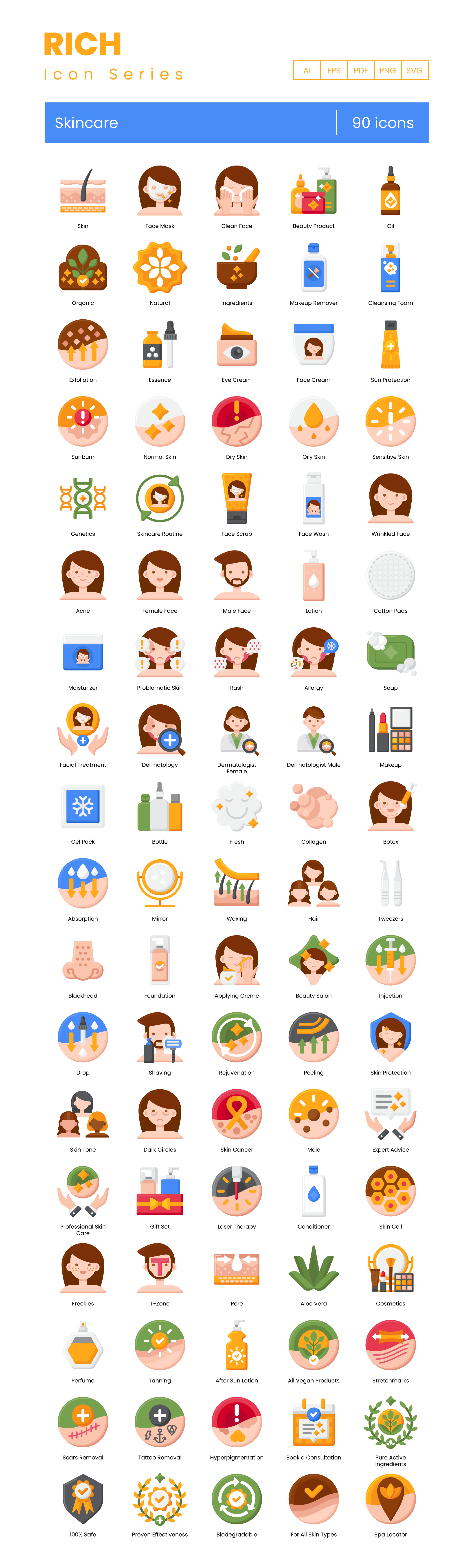 TL;DR: 90 Skin Health vector icons. 5 formats, fully customizable. Find the full icon list below.