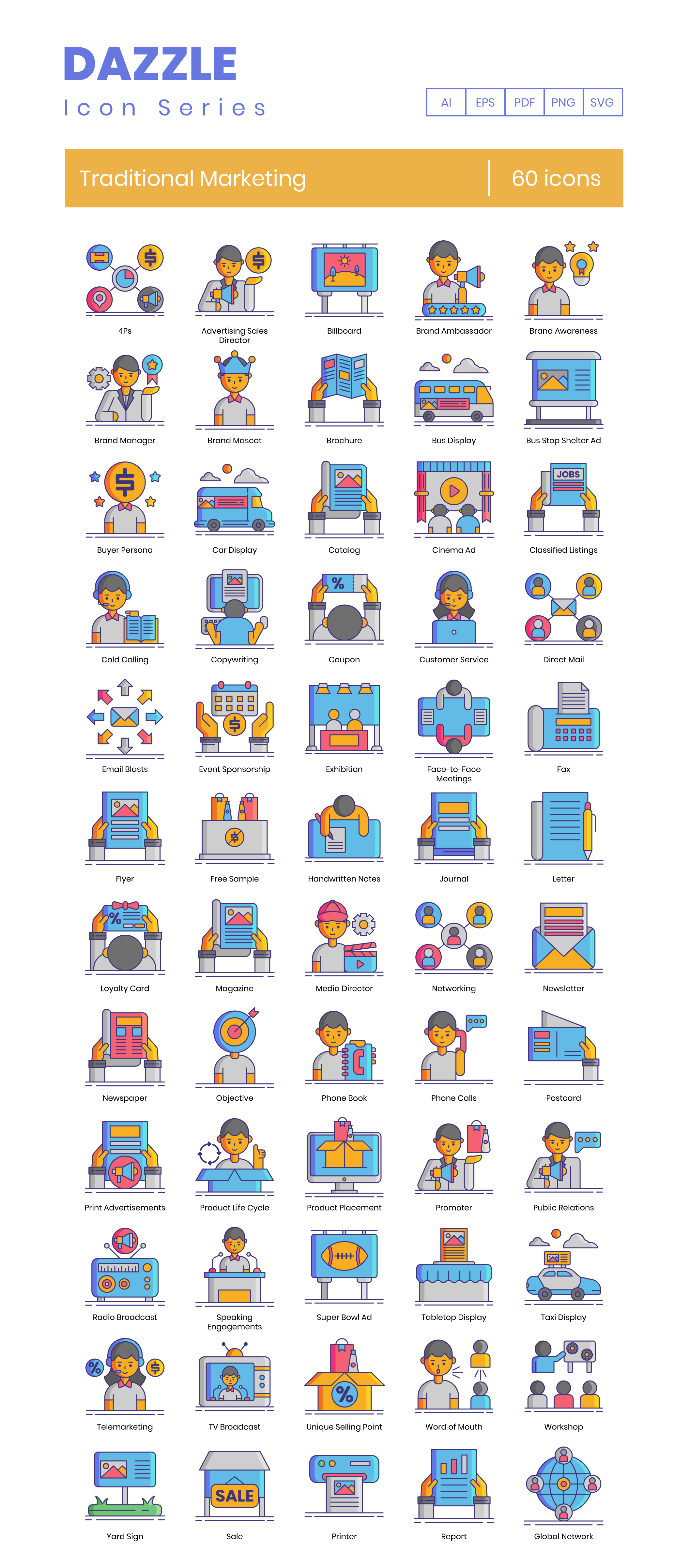TL;DR: 60 Traditional Marketing vector icons. 5 formats, fully customizable. Find the full icon list below.