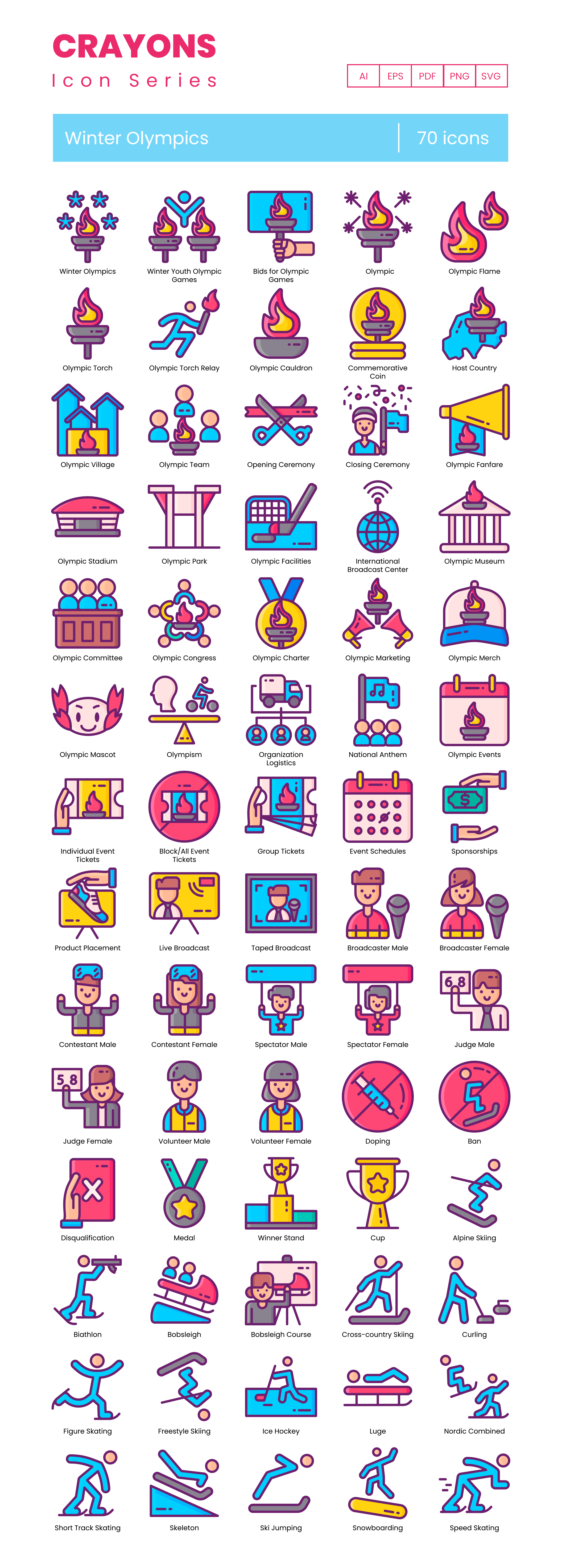 TL;DR: 70 Winter Sports vector icons. 5 formats, fully customizable. Find the full icon list below.